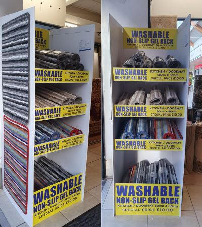 Customers want to see the products flat out and unrolled before they buy, so we've made a stand to display just that.With mats running down either side of each stand, people can see the colour and size, and get a better feel of the texture.What's better, we don't charge anything extra for them.