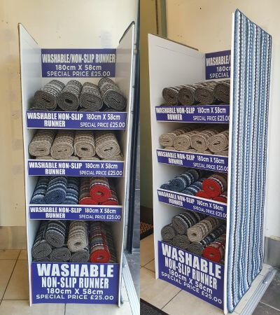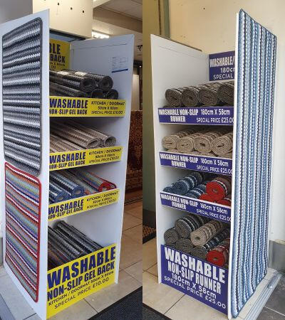 Customers want to see the products flat out and unrolled before they buy, so we've made a stand to display just that.With mats running down either side of each stand, people can see the colour and size, and get a better feel of the texture.What's better, we don't charge anything extra for them.